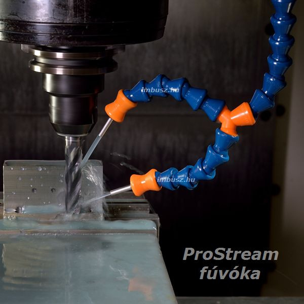 Az 1/4 es Loc-Line rendszer nem csak hagyományosan alacsony nyomású (30-50PSI azaz kb.2-3,5bar) rendszerekhez kínál megoldásokat. Magas nyomású fúvóka rendszeréhez többféle lehetőséget is kínál. Az egyik ilyen opció a ProStream fúvókarendszer. A 2x4 méretet felölelő ProStream fúvókák legnagyobb átmérőjű fúvókája a 4,1x12,7mm-es. A 4,1mm belső átmérőjű fúvókavég gondoskodik, hogy csak a legszükségesebb mennyiségű hűtőközeg mennyiség kerüljön felhasználásra. A 12,7mm hosszúságú fúvókavég kis helyigényű, mégis pontos beállíthatóságot is biztosít. A rozsdamentes acél hőkezelt fúvókavég mechanikus, vegyi és hőterhelési ellenállása is kiemelkedő, szemben a hagyományos nagyjából azonos méretű, de olcsóbb, méretben/rendszerben hasonló egyenes vagy könyök fúvókához képest. Míg a normál műanyag fúvókavégek ütésre, sérülésre, túlzott hőterhelésre jelentős maradandó károsodással vagy teljesen használhatatlan állapottal reagálnak, addig a ProSream fúvókák a véletlen balesetek nagy részét szinte károsodás nélkül is elviselhetik. Így nincs leállás, termelés kiesés, bosszankodás és újra rendelés. A 4,1x12,7mm-es ProStream fúvókák további előnye a rendkívül nagy állíthatósági szög. Míg a hasonló pl. 3mm-es hagyományos 1/4 es fúvóka csak a csatlakozási gömbnél állítható kb. 28-fokban (összesen 56 fok) minden irányban, addig a 4,1x12,7mm ProStream fúvóka ezen felül az acél végnél is állítható 36-fokban (összesen: 72-fok állíthatóság). Ráadásul az 1/4" rögzítő gyűrűvel fixálható a pozíció és tovább fokozható a nyomás, javítva ezzel a hűtés-kenés és tisztítás hatékonysága valamint maximalizálva a szerszám élettartama és optimalizálva a gép hatásfoka. Magas nyomáson üzemeltetve távolabbról is hatékony marad a hűtés/kenés.