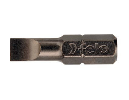 A Felo preciziós forgácsolással kialakított végződésű 6,5x1,2x25 mm méretű C 6,3 1/4'' inch/col befogó mérettel rendelkező lapos bitet gyárt. A 25mm hosszú standard Felo behajtóhegyek pontos megmunkálással és szigorúan ellenőrzött hőkezelési eljárással készülnek. A méretpontos kialakítás biztosítja, hogy a Felo szerszámok sem fordulnak el a csavarfejben és nem roncsolják a csavarokat. A króm-molibdén-vanádium acélból készült Felo hegyek tartós és jó megoldást kínálnak felhasználóinak. A Felo egyhornyú bitfejek gépi és kézi csavarbehajtóval is használhatók és több mint 100%-kal meghaladják az ISO és DIN szabványok követelményeit.
