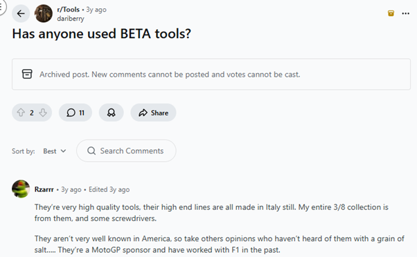 „Nagyon jó minőségű szerszámok. A felsőkategóriás termékeiket még mindig Olaszországban gyártják. Az egész 3/8-os készletem tőlük van, és van néhány csavarhúzóm is a Betától. Amerikában nem annyira ismertek, ezért érdemes fenntartással kezelni azok véleményét, akik még nem hallottak róluk. A BETA a MotoGP-ben is szponzorként jelen van, korábban pedig a Forma–1-ben is dolgoztak együtt csapatokkal.”