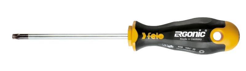 Az Ergonic® a világ első csavarhúzó markolata, mely a markolatban található zselés anyagnak köszönhetően a felhasználó tenyerébe idomul és egyedülállóan kényelmessé teszi a munkavégzést, valamint legalább 20%-kal hatékonyabb erőkifejtést tesz lehetővé, melynek köszönhetően vagy kisebb a tenyér és kéz terhelése azonos erővel meghúzott csavar esetében, vagy még erősebben meghúzott csavarokat kapunk. Az Ergonic a legkényelmesebb Felo csavarhúzó típus, mely különösen nagy igénybevételre tervezett és első osztályú ergonomikus kialakítású háromkomponensű zselés markolatbelsővel, ütésálló markolatvázzal és csúszásbiztos fogással készül a nagy terhelhetőség és kényelmes felhasználhatóság érdekében. A fekete-sárga (400-as széria) markolat kialakításakor a tervezők ügyeltek arra is, hogy a Torx® csavarhúzó ne gurulhasson le ferde vagy enyhén rázkódó felületről. Az összes Felo csavarhúzóban azonos, kimagasló minőséget nyújtó króm-molibdén-vanádium acél ötvözetből készült Felo Torx® csavarhúzó pengék nagy csavaró nyomaték átvitelét teszik lehetővé, és a markolaton kialakított furatnak köszönheten egy másik Felo Ergonic csavarhúzó segítségével extra nyomatékot lehet átadni a csavarra, illetve ezen felül a furat a csavarhúzó kényelmes tárolását is segíti. A méretpontos kialakítás biztosítja, hogy a Felo szerszámok sem fordulnak el a csavarfejben és nem roncsolják a csavarokat. A krómozott pengeszár védi a szerszámot a korróziótól és a bevonat nélküli edzett hegyek rendkívüli pontosságot és hosszú távon megbízható használatot biztosítanak felhasználóinak. A Felo 408-as szériájú Torx® csavarhúzók több mint 100%-kal meghaladják az ISO és DIN szabványok követelményeit, Németországban készülnek, GS (Tüv) minőségbiztosítási rendszer alatt ellenőrzöttek és 15 év gyártói garanciával kerülnek forgalomba, hogy ne érje meglepetés és csalódás használat közben.